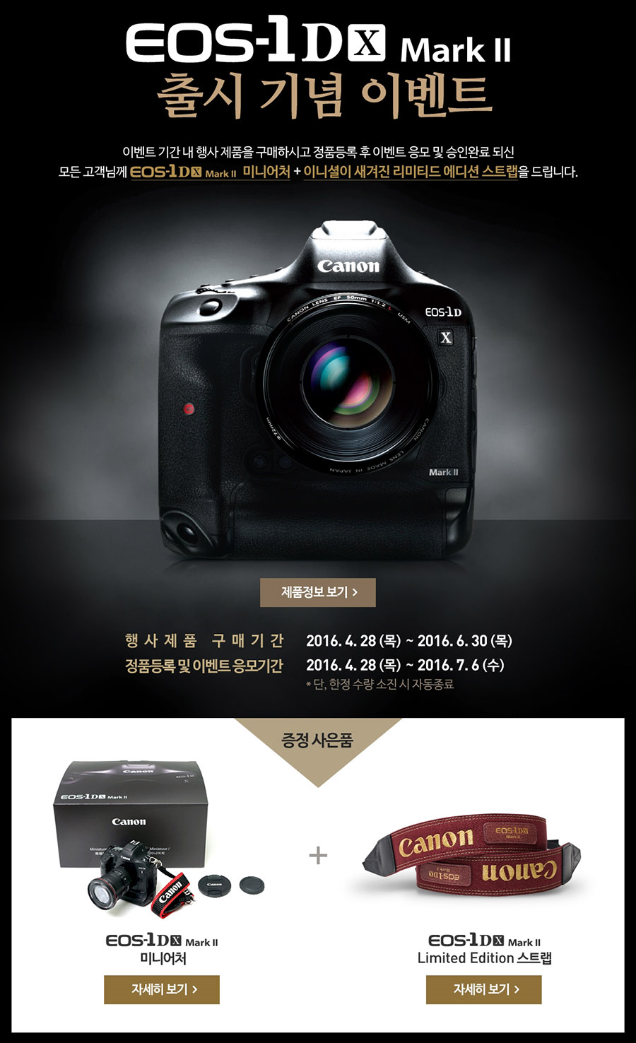 ij³íÀº EOS-1D X Mark IIÀÇ Á¤½Ä Ãâ½Ã¸¦ ±â³äÇØ 4¿ù 28ÀÏ(¸ñ)ºÎÅÍ 6¿ù 30(¸ñ)±îÁö EOS-1D X Mark II¸¦ ±¸¸ÅÇÑ °í°´¿¡°Ô Ưº°ÇÑ ¼±¹°À» ÁõÁ¤ÇÏ´Â Á¤Ç° µî·Ï À̺¥Æ®¸¦ ÁøÇàÇÑ´Ù. Âü¿©¹æ¹ýÀº À̺¥Æ® ±â°£ ³» Á¦Ç°À» ±¸¸ÅÇϰí 7¿ù 6ÀÏ(¼ö)±îÁö ij³íÄÚ¸®¾ÆÄÁ½´¸ÓÀ̹Ì¡ °ø½Ä ȨÆäÀÌÁö¿¡¼ Á¤Ç° µî·Ï°ú À̺¥Æ® ÀÀ¸ð¸¦ ¸¶Ä¡¸é µÈ´Ù.