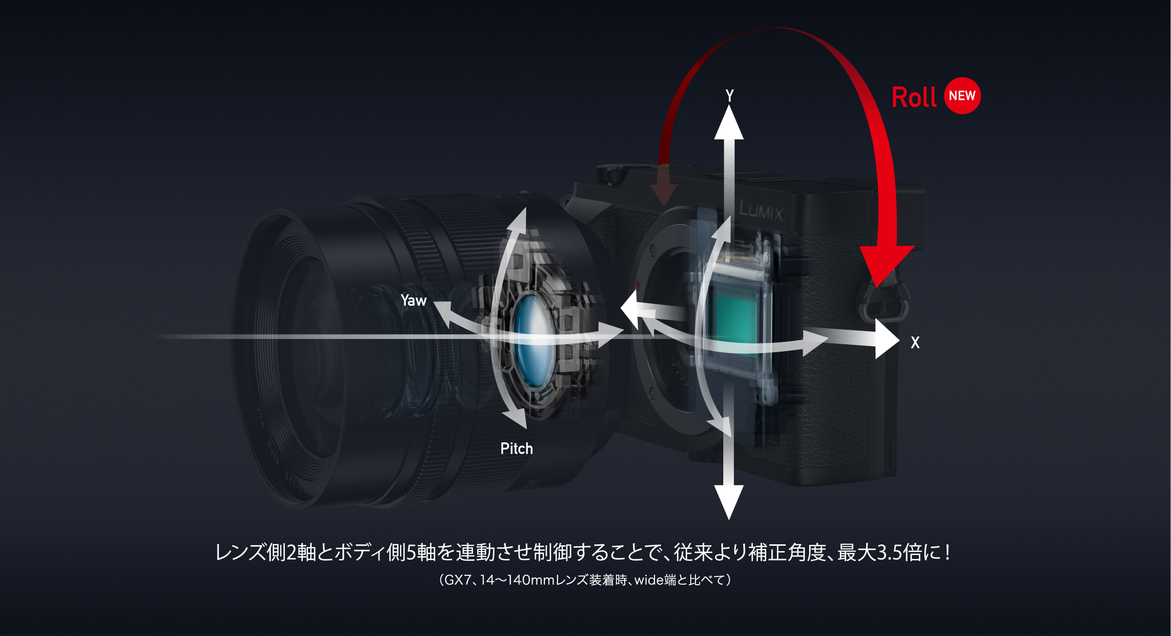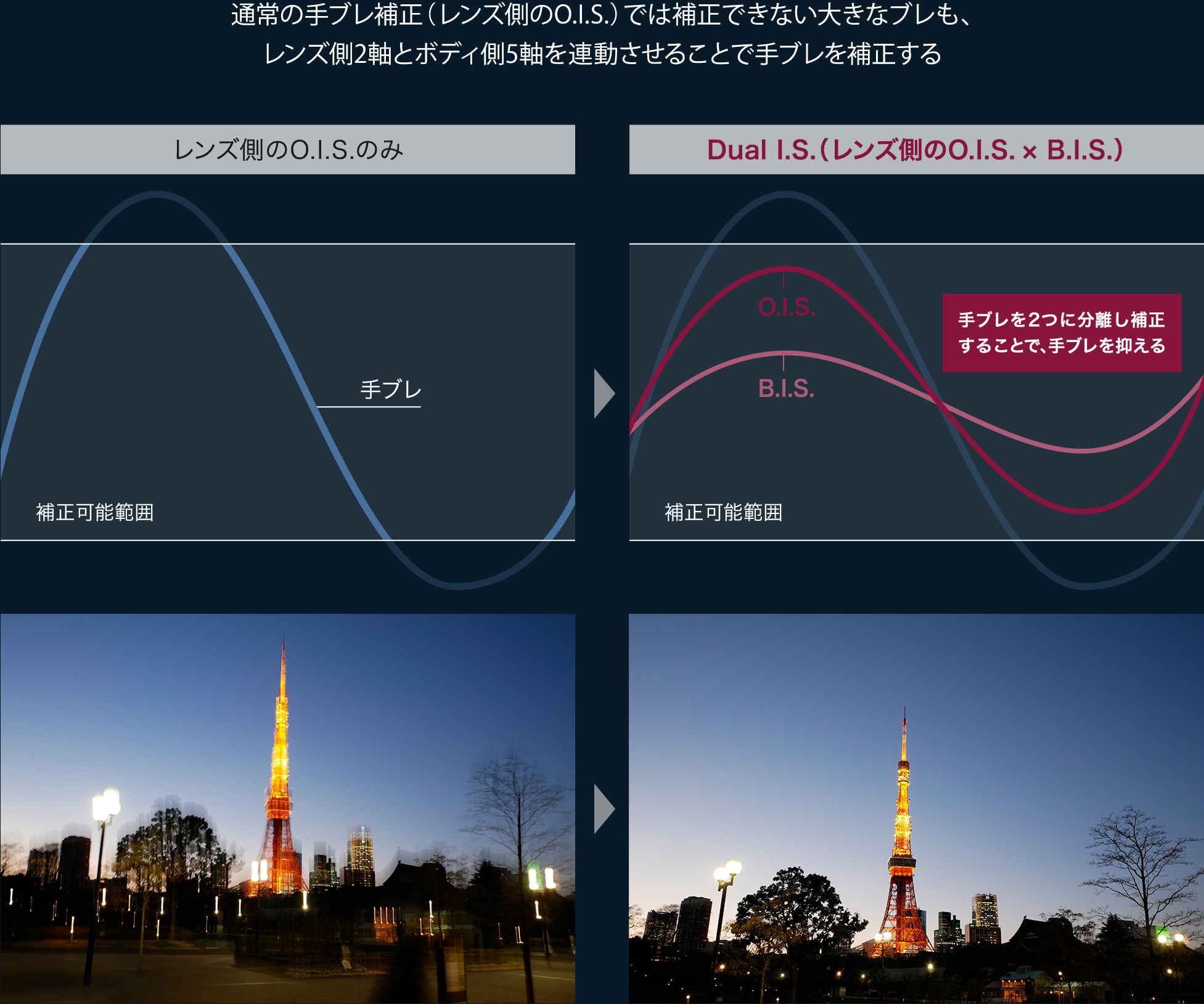 ½Å°³¹ßÀÇ "5Ãà ¼Õ¶³¸² º¸Á¤"žÀç (¼Õ¶³¸² º¸Á¤ È¿°ú : 4´Ü¡Ø1 )¿¡ ÀÇÇØ, ¼Õ¶³¸² º¸Á¤ ±â´ÉÀÎ 'Dual IS'µµ »õ·Î¿î ÁøÈ¸¦ ÀÌ·ç¾ú½À´Ï´Ù. »óÇÏ ÁÂ¿ì °¢µµ ¶³¸² (Pitch / Yaw)°ú ȸÀü ¹æÇâÀÇ Èçµé¸² (Roll) »óÇÏ Á¿ìÀÇ º´Áø Ä¡¿ìħ (X / Y)ÀÇ Å« Èçµé¸²À» ³Î¸® º¸Á¤ÇÏ´Â 5 Ãà ¼Õ¶³¸² º¸Á¤°ú »óÇÏ ÁÂ¿ì °¢µµ Èçµé¸² (Pitch / Yaw)ÀÇ ¼¶¼¼ÇÑ ¶³¸²À» º¸Á¤ÇÏ´Â 2 Ãà ·»Áî¿¡¼ ¼Õ¶³¸² º¸Á¤À» ¿¬µ¿½ÃŰ´Â °ÍÀ¸·Î, ´Ù¾çÇÑ ÃÔ¿µ Àå¸é¿¡¼ ¹ß»ýÇÏ´Â ¼Õ¶³¸²À» °·ÂÇÏ°Ô º¸Á¤ÇÕ´Ï´Ù. ¶ÇÇÑ, »õ·Î¿î ¹Ùµð Ãø¿¡ žÀç µÈ È¸Àü ¹æÇâÀÇ Èçµé¸² (Roll) º¸Á¤ ±â´ÉÀº ±¤·®ÀÌ ÀûÀº µµ½ÃÀÇ ¾ß°æÀ» ÃÔ¿µ °°Àº °æ¿ì µî¿¡ ¹ß»ý ·»Áî¿¡ ¼Õ¶³¸² º¸Á¤ÀÌ ¾î·Á¿î ȸÀü Ä¡¿ìħµµ Á¦´ë·Î º¸Á¤ Çϰí ÀÚ¿¬ÀûÀÎ µµ½ÃÀÇ Ç³°æÀ» Àý´Ü ÇÒ ¼ö ÀÖ½À´Ï´Ù.