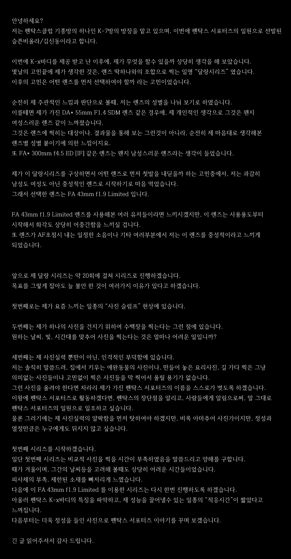 ........ ¹®Á¦´Â ´ç½Ã ÀÌ¹Ì Ã¼Çè±â¸¦ ¾Ö¿Ï µ¿¹° »çÁøÀ̳ª ¿ä¸® »çÁø ±æ°Å¸® ½º³ÀÀ» ¿Ã¸° ´Ù¸¥ ¼Æ÷ÅÍÁîÀÌÀÚ ÇÔ²² ÀÖ´ø ȸ¿ø ºÐµéÀÌ ¿ø»öÀûÀÎ ºñ³À» ¹ÞÀº ´À³¦À» ¹Þ¾Ò½À´Ï´Ù. "±×·± »çÁøÀ» ¿Ã·Á¾ß ÇÑ´Ù¸é," ¿¡¼ ±×·± »çÁøÀ̶õ À§ÀÇ °ÍÀÌÁö¿ä. ¶ÇÇÑ µÚ¿¡ ½º½º·Î°¡ ¹þµµ·Ï ÇϰڽÀ´Ï´Ù.