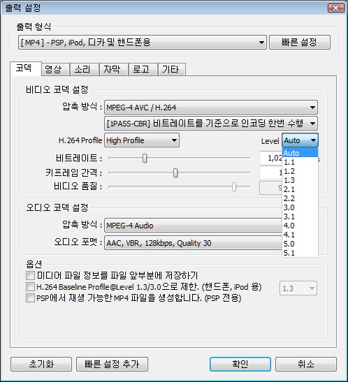 ÀÎÄÚµù ¼³Á¤ÀÌ mp4, avi, wmv... ºñÆ®·¹ÀÌÆ®, ŰÇÁ·¹ÀÓ, À½¼ºµµ ¼¼ºÎ ¼³Á¤ °¡´ÉÇÕ´Ï´Ù